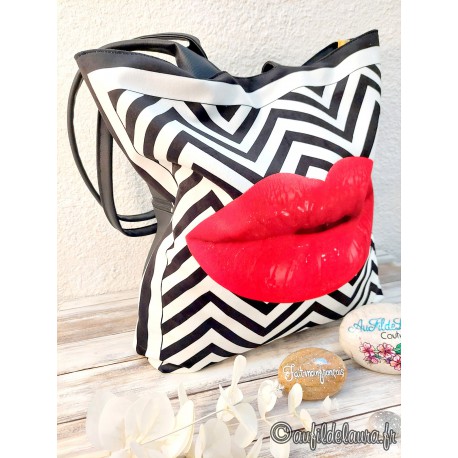 Très joli sac à main noir à tendance Glam'chic avec impression belle bouche rouge et chevrons noirs et blancs. Simili cuir grainé noir, anses porté épaule. Sac à main de créateur français. Chouette intérieur imprimé rétro disco, plusieurs poches. Sac à main très spacieux. Charms très féminins.