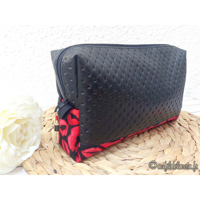 Matières trousse : simili cuir noir, coton imprimé Kiss Lips, intérieur coton matelassé noir
